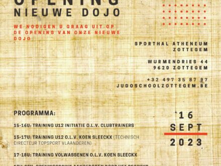 Op zaterdag 2 september starten we ons nieuw judojaar in de nieuwe dojo in het KAZ (eerste verdieping) aan de Wurmendries te Zottegem. Maar …op zaterdag 16 september gaat de dojo officieel open met o.a….
