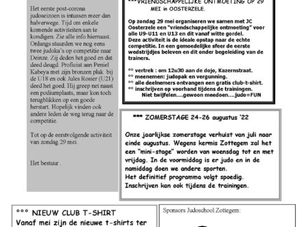 In ons “tatami-nieuws” kan je alle info vinden over de komende activiteiten van onze judoschool. Voor de jeugd is er op zondag 29 mei een “vriendschappelijke ontmoeting” met en in Oosterzele. Alle U9-U11 en U13…