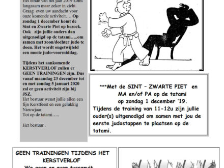 Op zondag 1 december waren de ouders van onze jonge judoka’s uitgenodigd om samen met hun kroost een aangepaste judo-les te volgen…. Vrij onverwacht bracht ook de Sint en Zwarte Piet een bezoek aan de…